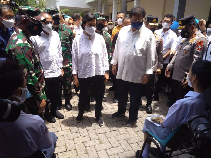 艾朗卡统筹部长与穆丽雅妮财政部长和国家警察刑侦处长阿古斯Agus Andrianto 中将一起抵达棉兰市的星街 ,与当地的小贩摊商交流,询问了在新冠病毒大流行期间买卖状况。
