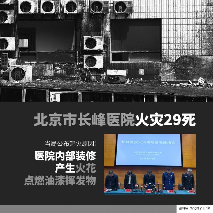 【华闻】北京讯。4月18日12时57分,北京长峰医院住院部东楼发生火情。截至19日9时,经转院救治无效,29人遇难,其中,26人为住院患者、1名护士、1名护工、1名患者家属。经初步调查,事故系医院住院部内部改造施工作业过程中产生的火花引燃现场可燃涂料的挥发物所致。