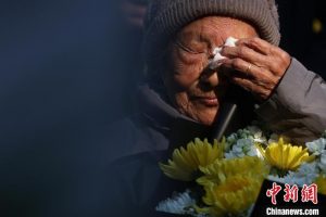 12月3日,南京大屠杀死难者家庭祭告活动在侵华日军南京大屠杀遇难同胞纪念馆举行。活动中的夏淑琴抹去泪水。泱波 摄
