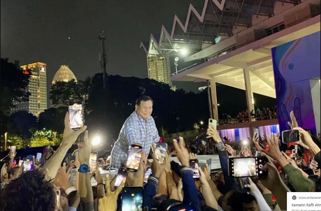 普拉博沃与副总统候选人吉布兰(Gibran)一同前往史纳延体育馆。他们在支持者面前发表讲话,感谢快速计票的结果,该结果显示他们在2024年总统选举中处于领先地位。