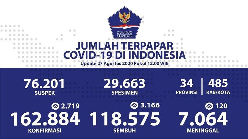 【好报】雅加达讯。全国新冠确诊病例持续上升。周四中午12时已达到162.884例。这是全国34省485个县市的疫情报告。