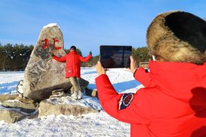 在漠河市北极村,游客拍照留念。新华社记者徐凯鑫 摄