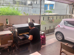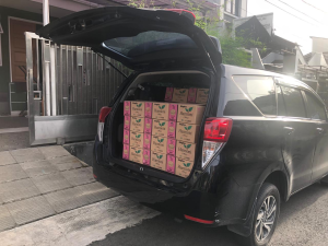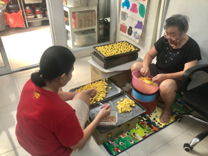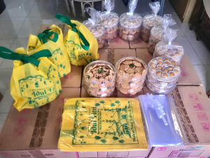 随着时间的推移,订单陆续稍有增加,但仍在我们的掌控之中。眼看完成的糕点越堆越多,终于到了交货的时候了。交货前还需要用塑胶袋子把三款糕点包在一起,再放入开斋节图案的手提袋子里,装入礼盒。