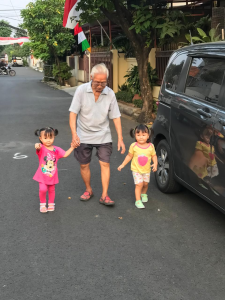他支着膝盖喘气,银丝在晨雾里泛着微光,手中网兜里的柑橘滚落两三个。塔台突然亮起警示灯,老式螺旋桨开始转动,隔着三十米距离,我们像默片里失语的演员。他最终摆摆手,无奈地转身离开。父亲失望而归的这一幕,还有他晚年在住家门前的小巷,欣然含笑、双手各牵一小曾孙女散步的画面同样让我刻骨铭心,永生难忘。