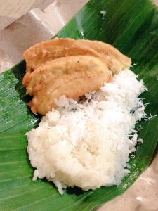 咖啡店外推车小贩只卖两味:蒸糯米饭( pulut ),除搭配新鲜椰丝椰糖浆,还配裹了微咸面糊炸得松脆的炸香蕉,另一道就是 lupis了。它们都是一个五岁幼稚园孩子人生最初的早餐主角之一,当年并不知道它们会成为去国之后最想念的美食。究竟是何人发明这种巧妙完美的搭配?赋予舌尖如此妙不可言的享受?也许是味觉有特别天赋的某位厨娘?来源怕已不可考。