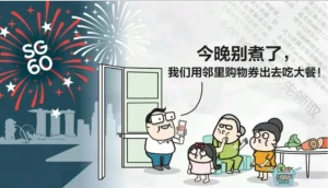 新加坡实施双语教育政策,华人都会讲华语和英语,由是观之,“SG60”是个个性很强,独具匠心,饱含浓郁的新加坡色彩的字母词。请看《联合早报》8月5日和8日刊出的两幅漫画。