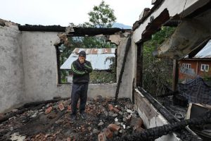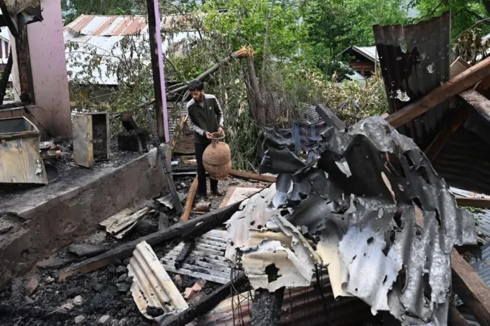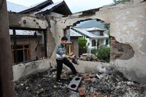 在印度控制克什米尔首府斯利那加以北约110公里的实际控制线附近萨拉马巴德,一名男子站在印巴冲突摧毁的房屋废墟中哭泣。