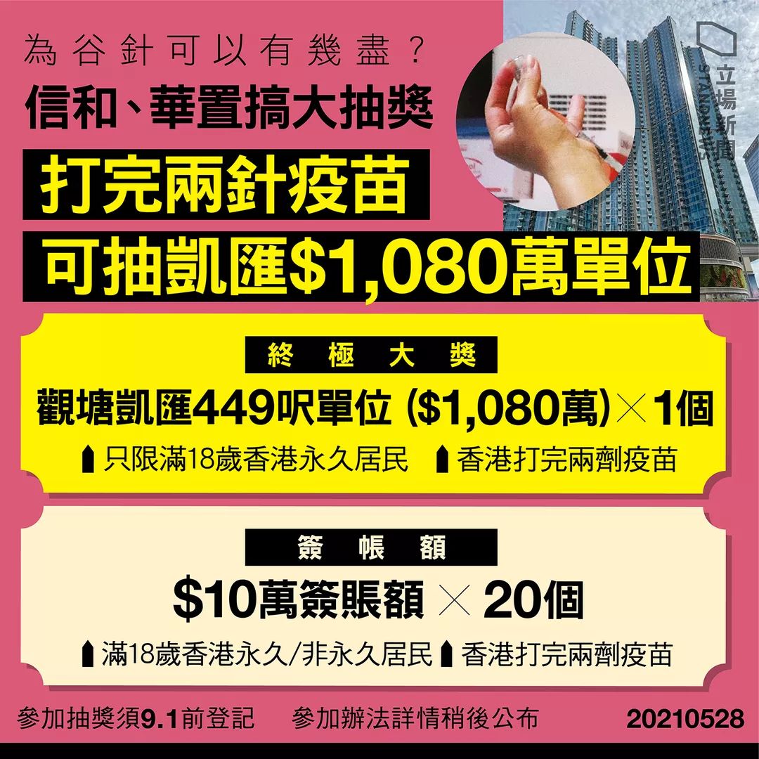 更为重磅的奖励,莫过于香港信和集团旗下黄廷方慈善基金及华人置业集团宣布,共同捐出一个价值1080万港元的全新住宅单位,以抽奖形式赠予已接种新冠疫苗的香港永久性居民。这对于对置业情有独钟、视“上车”为人生终极梦想的港人而言,吸引力可见一斑。
