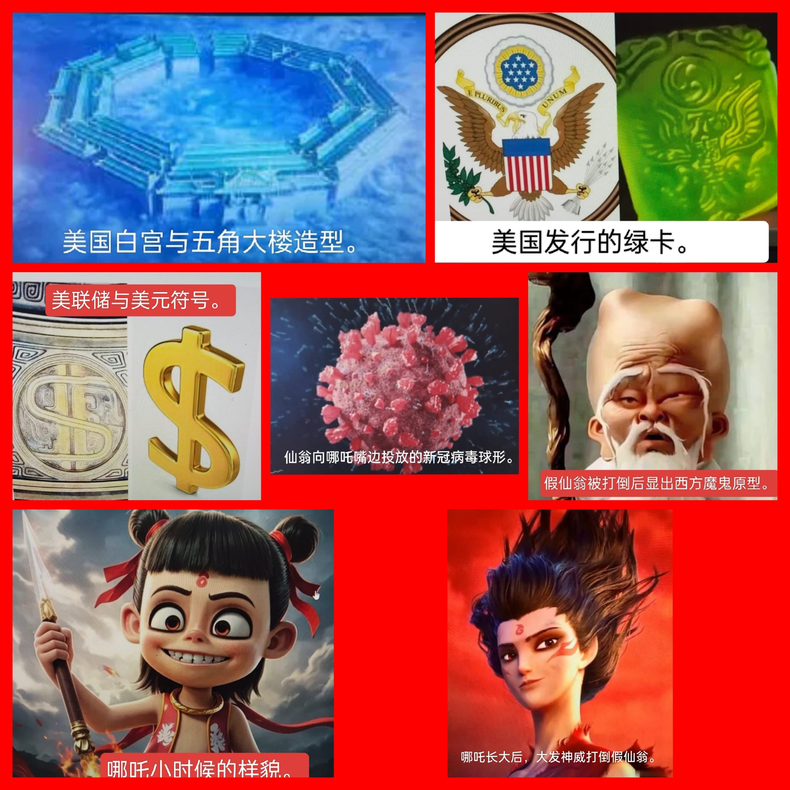 但对我们东方人了解中华文化与中国历史的观众,好些人都能从影片的快速节奏中,看清楚与捕捉到《哪吒2》,不但含有中华因素,更显露出许多美国与西方的象征印记,例如(图片1)是美国白宫与五角大楼的构造型,(图片2)是美国发行的“绿卡” (图片3与4)是美联储与发行的美元符号 (图片5) 是仙翁向哪吒 嘴边投放的新冠肺炎(COCID19)病球模样。(图片6)哪吒小时侯的样貌(图片7)哪吒长大崛起后,大发神威抗击打倒仙翁西方列强,(图片8)假仙翁被打倒钩现出西方魔鬼原型。
